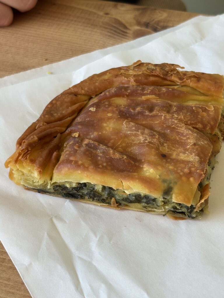 Also new to the area is a Turkish/UK café ‘Roots’ located next to the tube and its here we find ourselves having lunch with the ever ebullient Karen from Finance. She opted for a spinach and feta pie as she thought it looked identical to what she had enjoyed on several occasions in Athens. It’s a super-crisp filo-type pastry encasing a thick layer of spinach, feta, mint with a hint of nutmeg. Karen was sold on the authenticity. When we pointed out that we were, in fact, in a Turkish café Karen shrugged her shoulders and said ‘yeah whatever….same thing’.