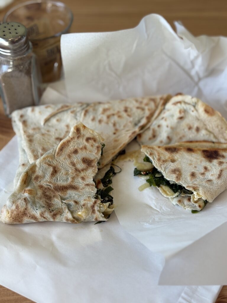 Your scribe ordered the spinach and cheese Gozlene. Gozlene is a kind of stuffed Turkish turnover a bit like Pide but folded over like a calzone. Spinach and feta is the most common stuffing but it can also include minced meats. Both of ours were toasted, giving them that oozy kick, with the spinach deluding into a vision of it actually being healthy. Well recommended. There’s no use in buying an overpriced drink as they’ll happily give you tap water.