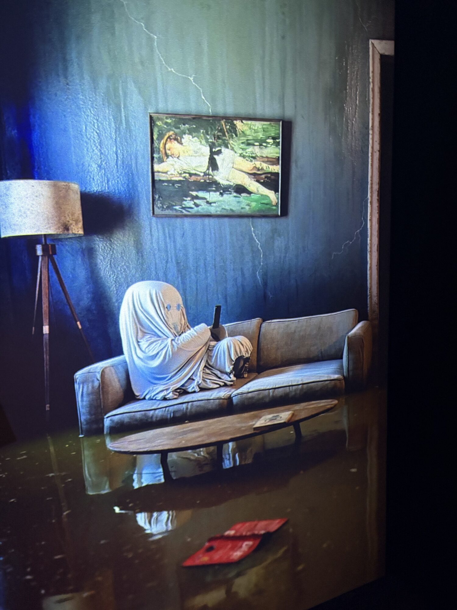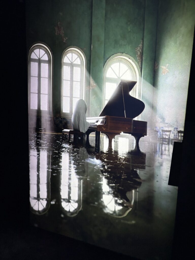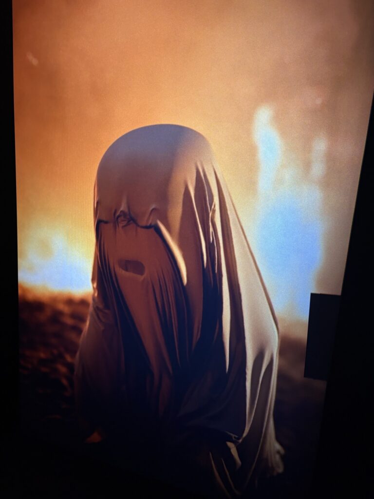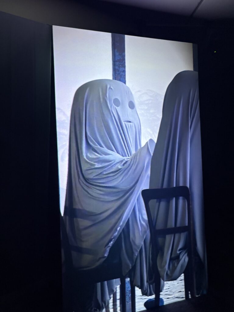 The current offering at Gasworks is by Portuguese American artist Gabriel Abrantes and is called ‘Bardo Loops’. The animated ghosts reference a phase between death and rebirth. Think of them as really articulate zombies. The ghosts talk about a range of topics without the other ghost listening (they are dead after all) in a friendly and almost mocking tone. The challenge for the viewer is that some of these topics are indeed very serious, but made to look trivial. Abrantes uses the ghosts as a way to explore issues relating to loss, illness and vulnerabilities. The manmade disasters unfolding behind them (eg a forest fire) seem minimal as we remain trapped in our own drama, ultimately only getting out of said drama by the use of our phone or AI. Or both.