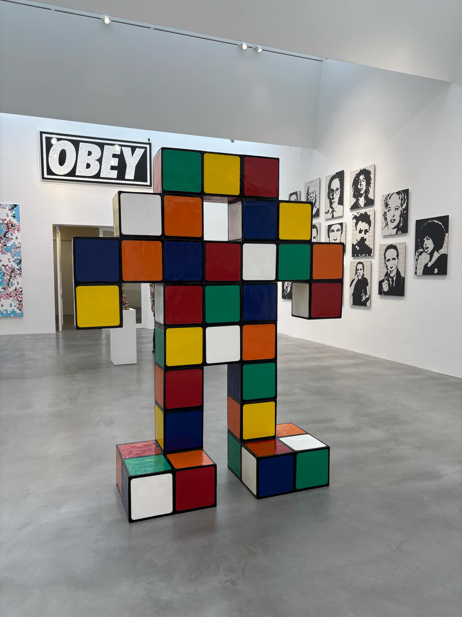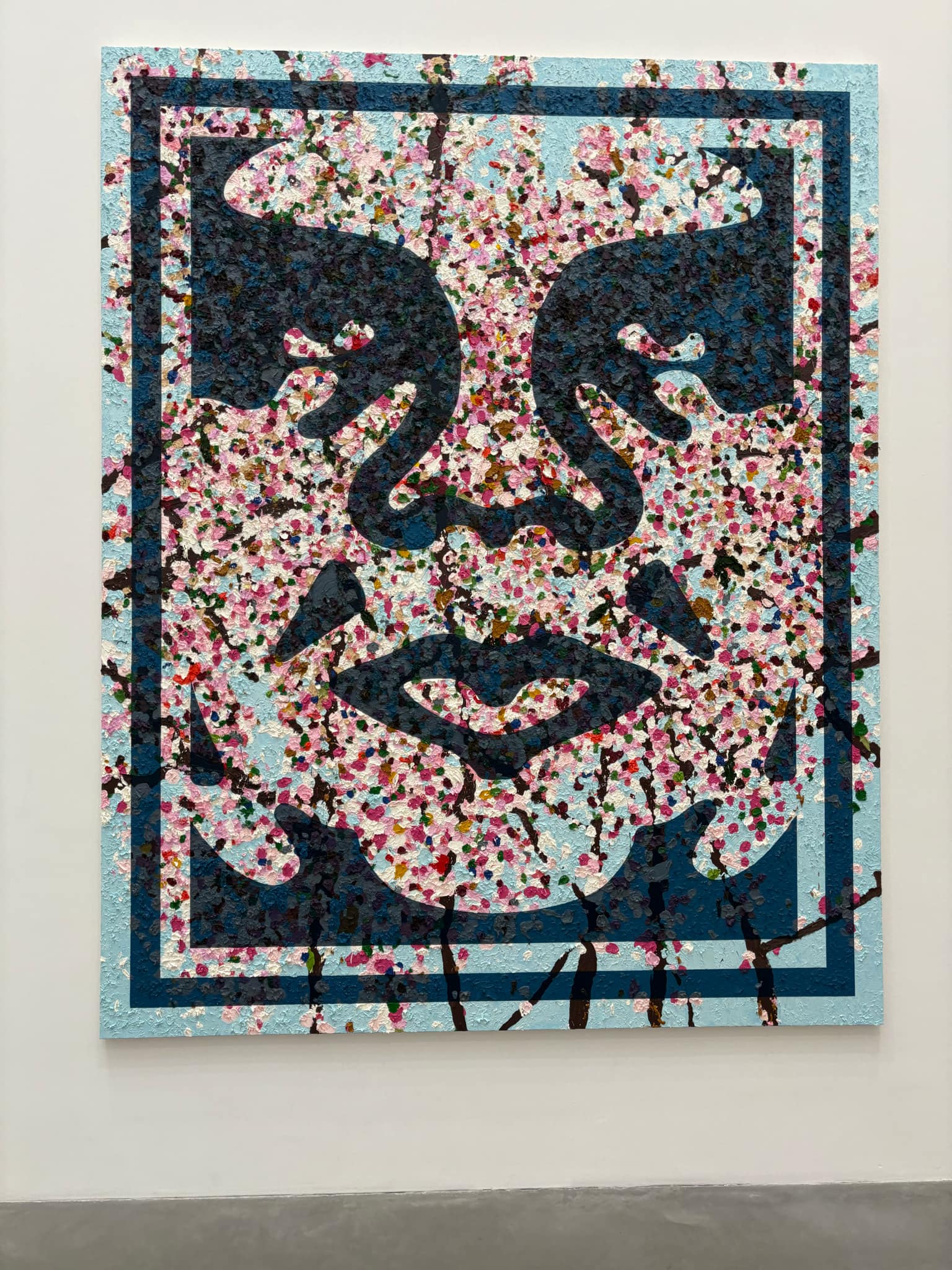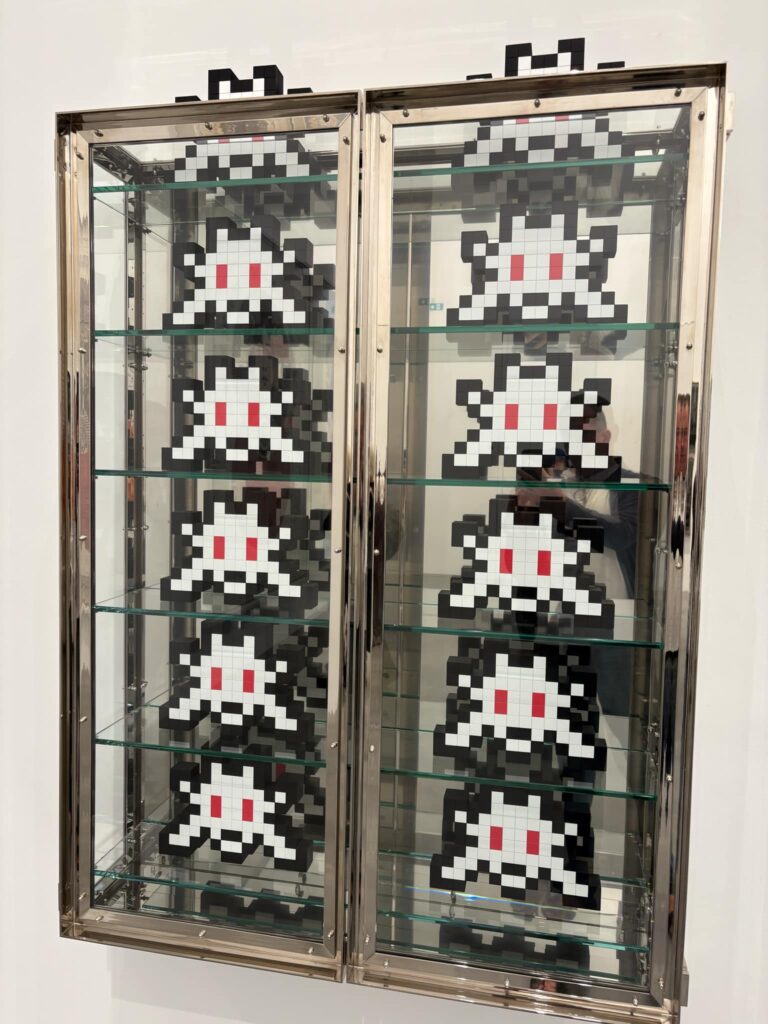 This exhibit gets right to the point, and in Room 1 we’re face to face with an inviting mix of the sinister and the playful. We see Hirst’s ubiquitous medicine cabinet filled with happy Space Invaders, a bloodied Sid Vicious looking at Hirst/Invader’s serene one eyed Mandala. We then move on to Fairley’s ubiquitous Andre the Giant given a softer tone by Hirst’s blossoms, following on to a lively space invader trapped in, you guessed it, formaldehyde.