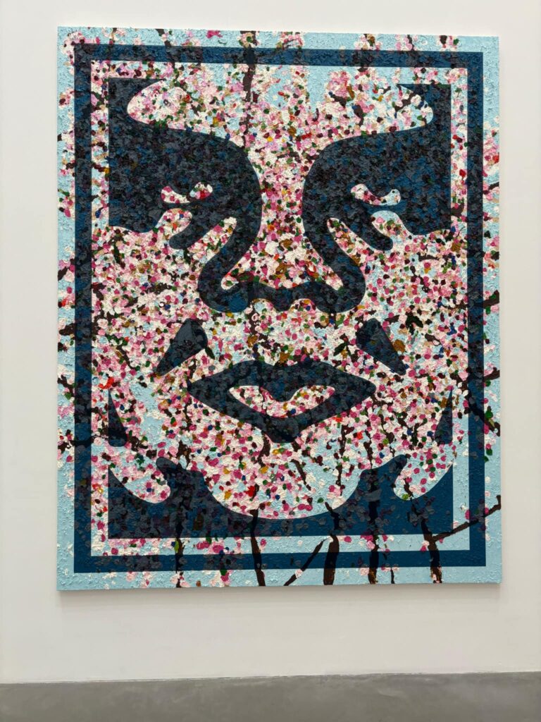Triple Trouble is collaboration of mostly new works between Invader (responsible for the Space Invader mosaics), Shepard Fairley (responsible for the Obama ‘Hope’ and OBEY brand) and Damien Hirst (responsible for dead flies and severed cow heads in formaldehyde). If you think you haven’t seen the work of Invader and Fairley then you’re wrong as they have deeply penetrated the pop universe over the past twenty years. There’s even a fake Invader next to ‘Samsun Kebab’ Kennington Cross.
